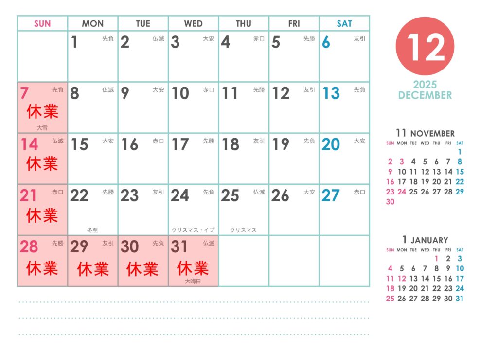 12月休業日のお知らせ 2025年11月19日 最終更新日時 : 2025年11月19日 asahishouten ご不便をお掛けいたしますが、ご容赦くださいますようお願い申し上げます。 12月27日(土)は通常通り営業いたします。