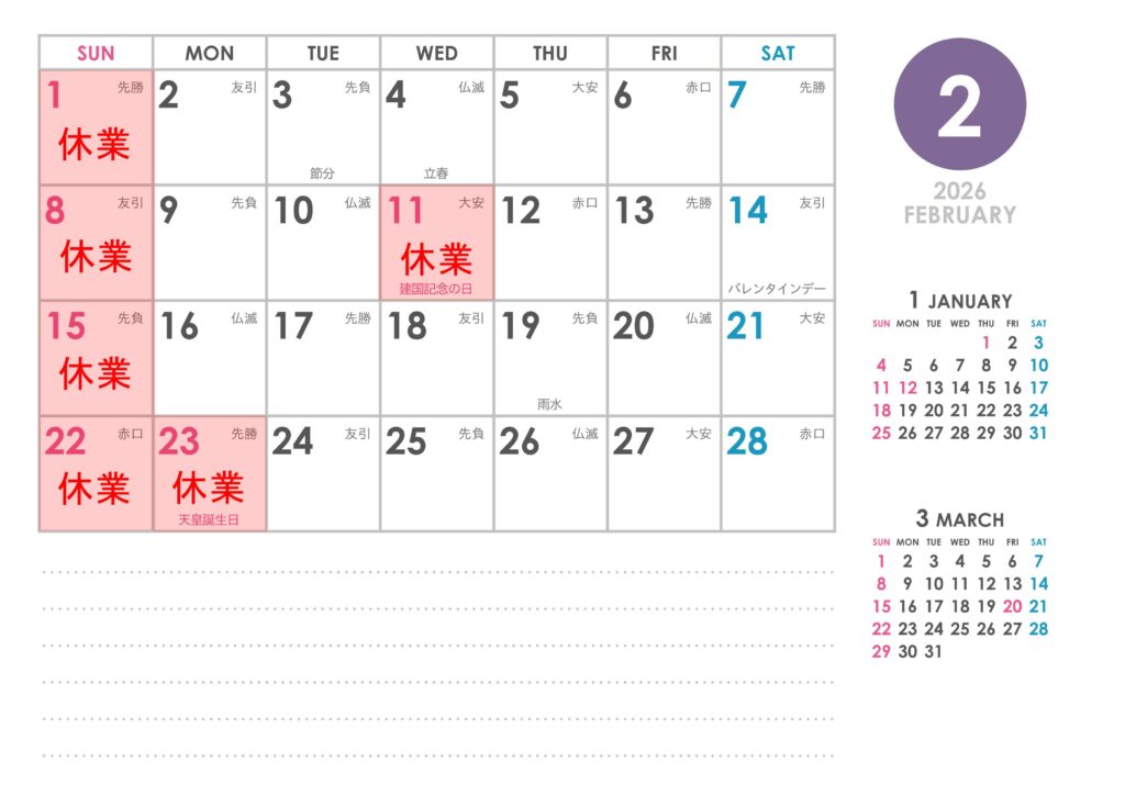 2月休業日のお知らせ